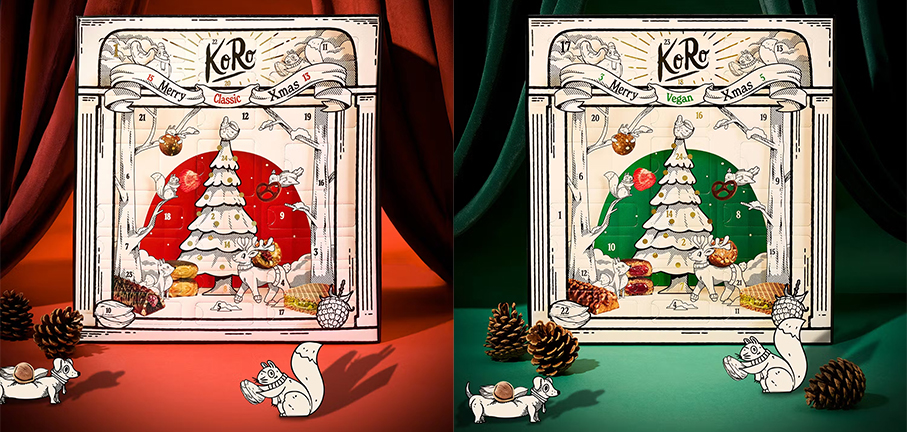 Calendario dell’Avvento 2025 - KoRo un viaggio di 24 giorni tra snack dolci, salati e fruttati in due versioni, una classica e una vegana. Dal design super natalizio e con un tocco di ironia, il calendario si ispira a un vero e proprio “teatro natalizio”: ogni porticina è un piccolo atto di un grande spettacolo di sapori, che si conclude – con gusto – la sera del 24 dicembre. La versione classica contiene 24 delizie selezionate tra i best seller e alcune novità esclusive: mix di noci croccanti, frutta secca, palline energetiche e barrette proteiche. Per accontentare tutti i palati e tutte le esigenze, anche la versione vegana. Niente più caccia agli ingredienti: dietro ogni porticina si nascondono solo delizie vegetali.