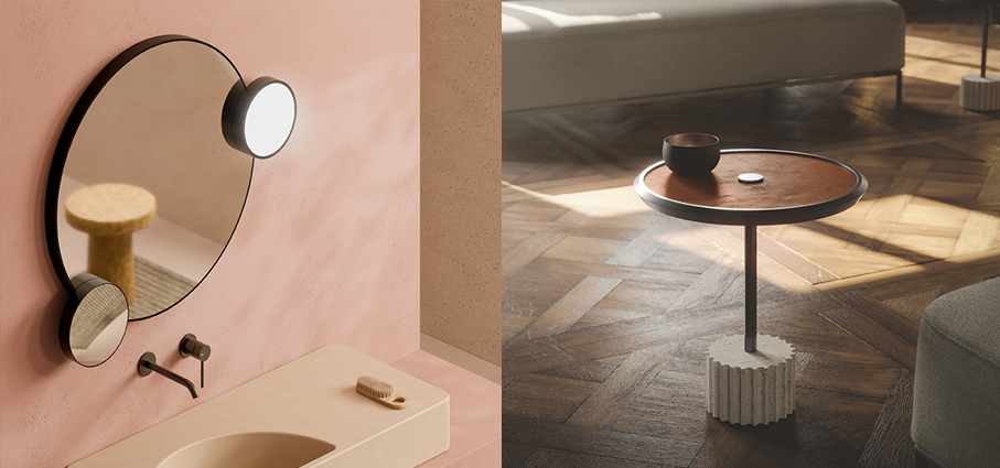Lunaris - Alice uno specchio dalla forma ispirata – come la stessa collezione – alle fasi lunari: la cornice in acciaio inossidabile verniciato a polveri con finitura nero matt o bianco matt e il profilo curvo e continuo disegnano un oggetto luminoso e contemporaneo. È corredato da due “satelliti” di 20 cm di diametro, che scorrono lungo la mezzaluna superiore e inferiore dello specchio e possono avvicinarsi tra loro. Da un lato, un’illuminazione a luce bianca naturale 4000 K, dall’altro, uno specchio concavo con effetto zoom, ideale per le fasi di trucco o rasatura.