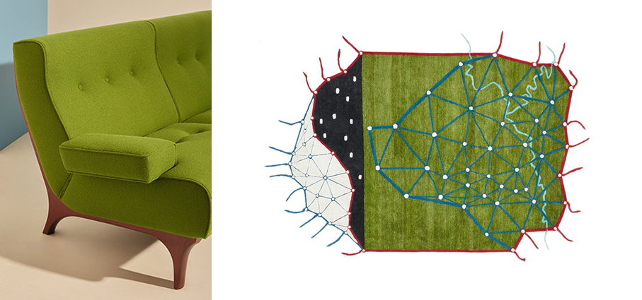 Topographie Imaginaire – Nodus appartiene alla collezione High Design Rugs. La topografia di un territorio immaginario è il tema di questo tappeto moderno in lana, seta di bambù, canapa e lino. Nella parte alta del manufatto è riconoscibile una zona montuosa. Nell’ampia parte bassa è posizionata una pianura solcata da corsi d’acqua. In tutto il disegno sono rappresentati alberi, uniti tra loro in una rete immaginaria di capillari. Un tappeto dalla forma irregolare che è un omaggio alla bellezza della natura e un monito a preservarla intatta.